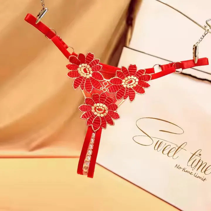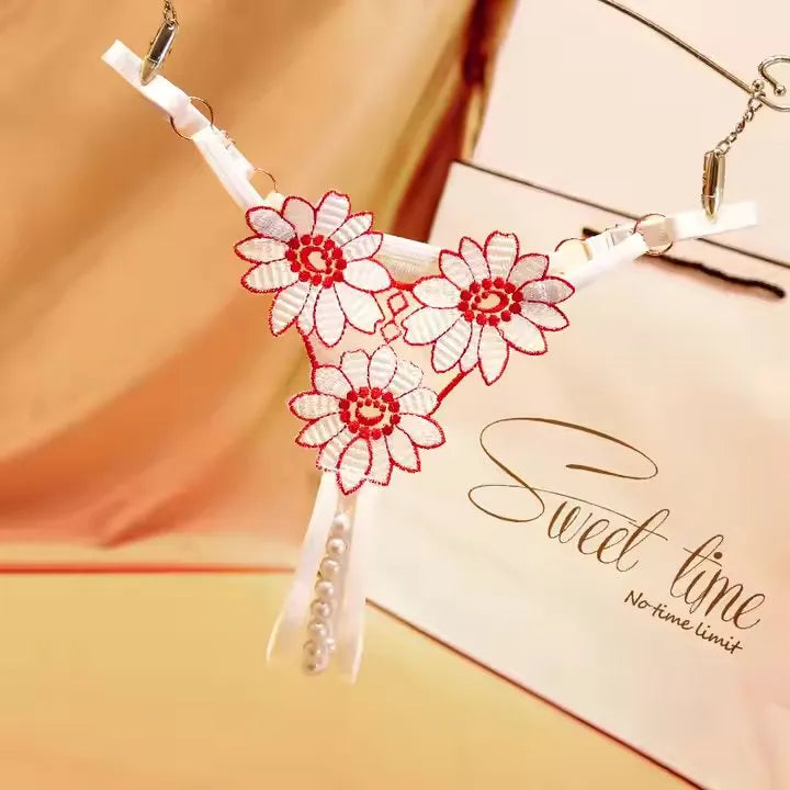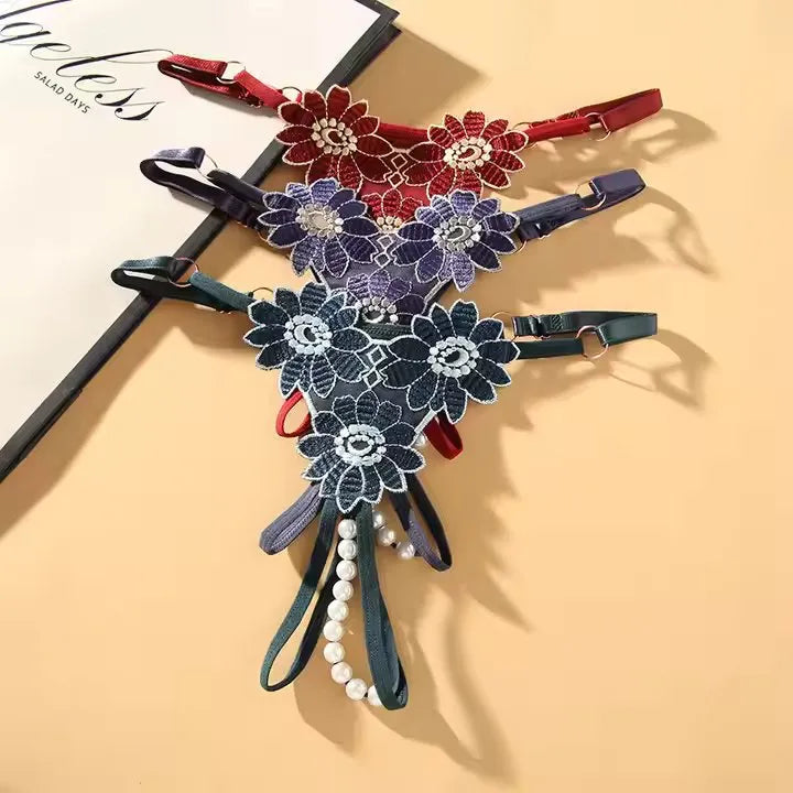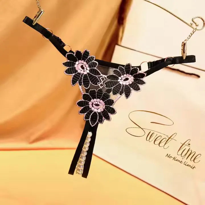 Lace Thong Panties 3D Embroidered Sunflower Pearl Crotchless T Back G-String Thongs Women Sexy Underwear - Black